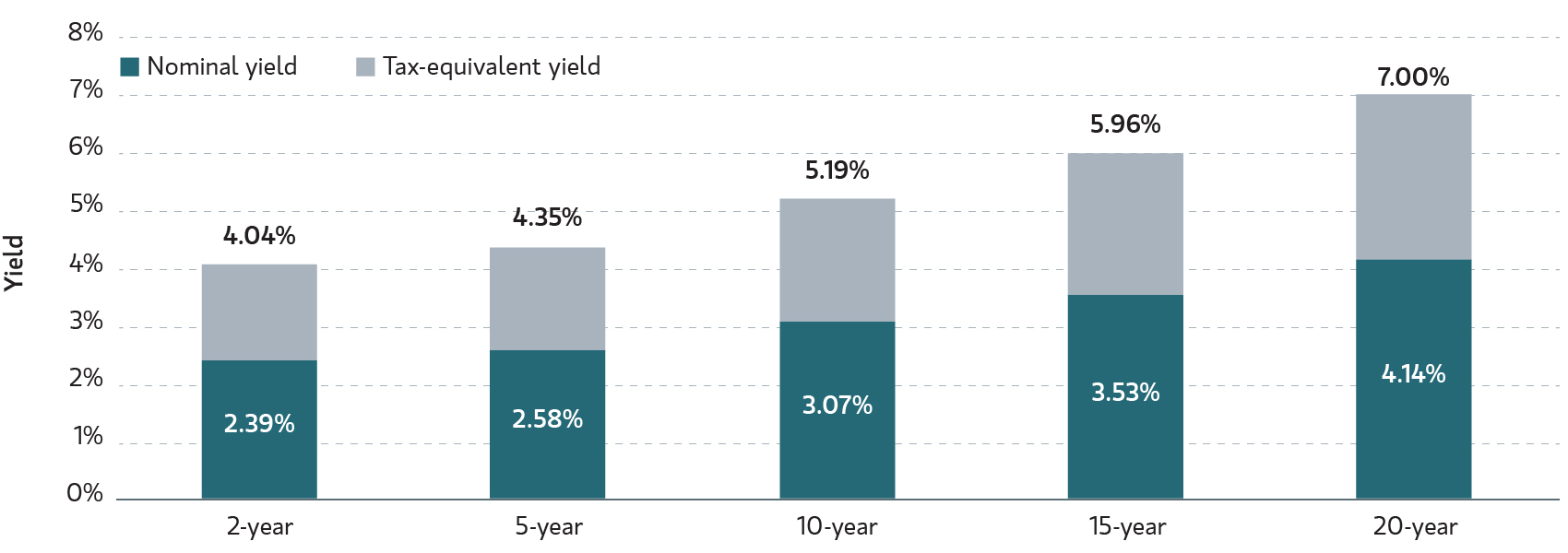 Five- to 20-year A-rated muni yields closed last week ranging from 2.88% to 4.54%, with related taxable-equivalent yields ranging from 4.86% to 7.67%, assuming a combined federal tax rate of 40.8% (Parametric, LSEG, 3/30/26).